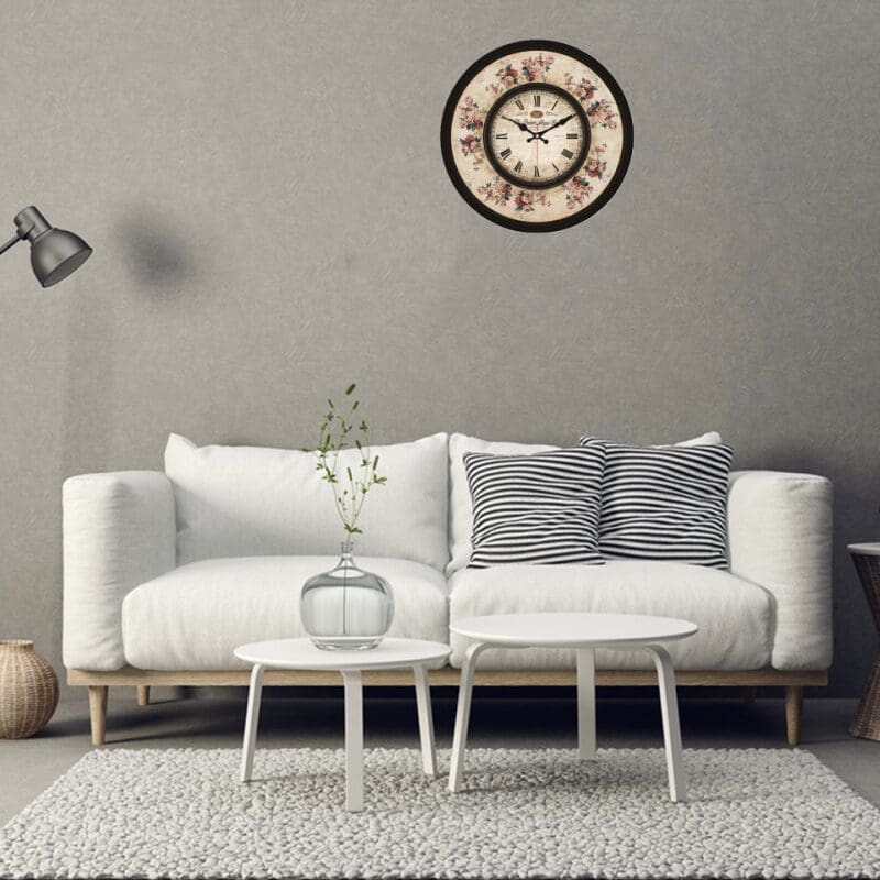 Une horloge décorative affichant un motif de fleurs sur un fond en papier imitation parchemin ancien. Le cadran est en bois et les chiffres sont de style romain pour un look rétro.